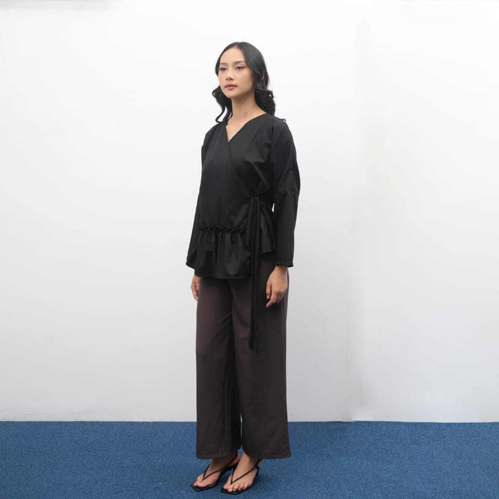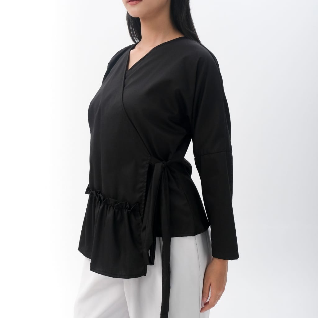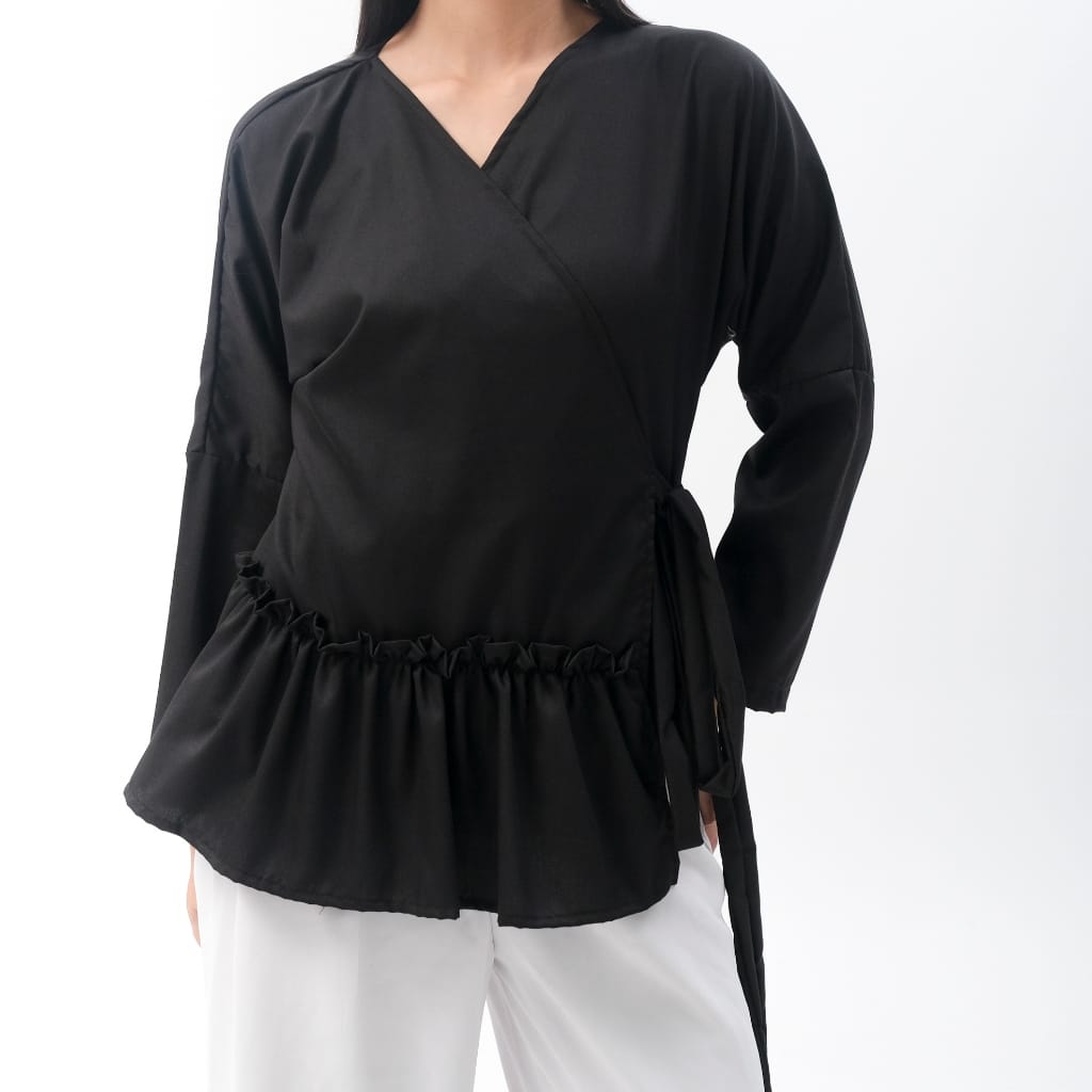 Blouse lengan panjang ini hadir dengan style kimono terdapata ruffle di depan . Potongan oversize longgar bikin nyaman, adem, dan tetap stylish dipakai kapan saja.