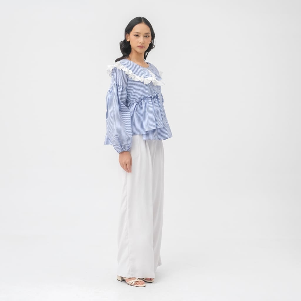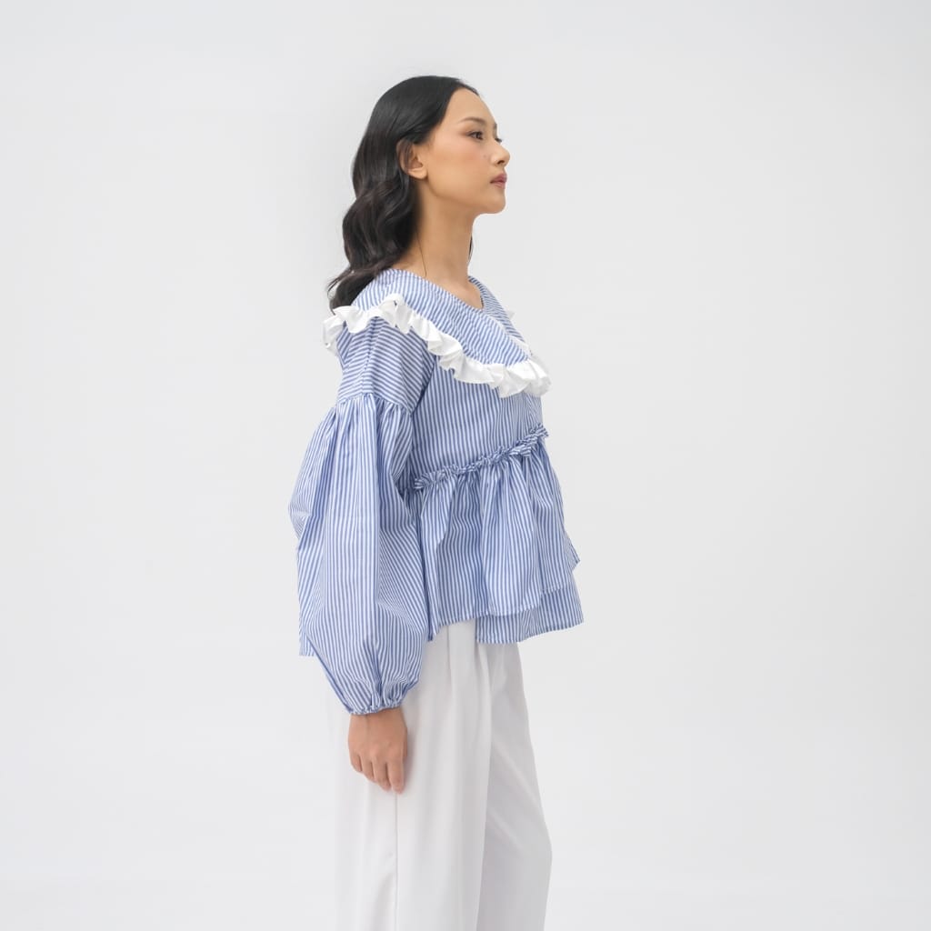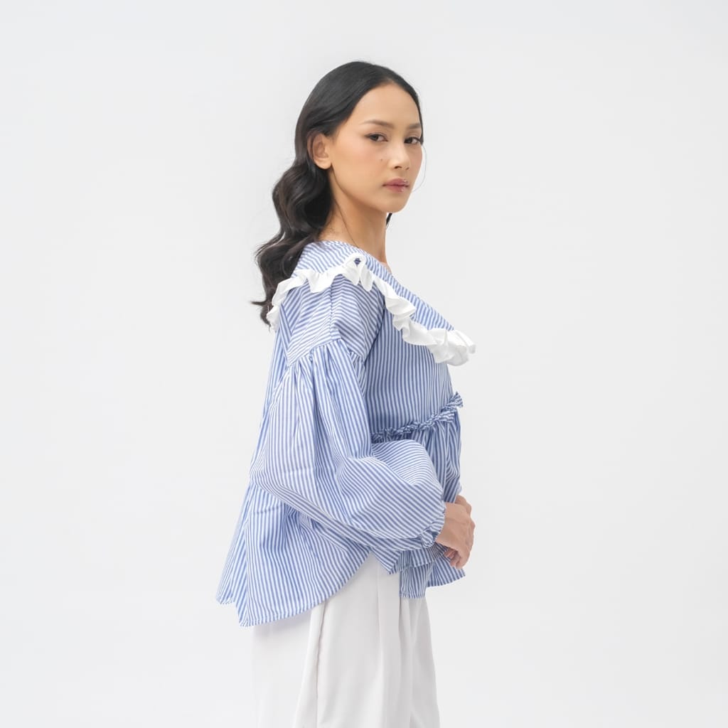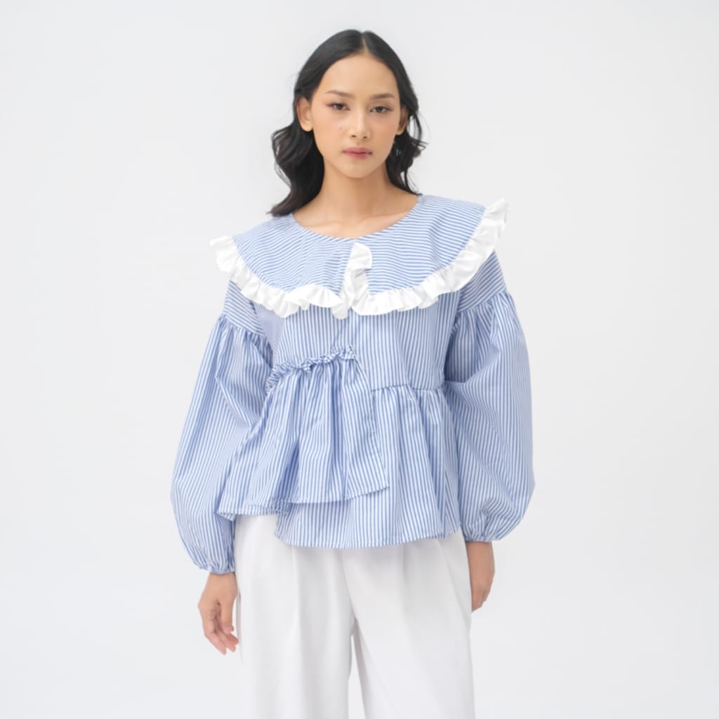 Medi Top adalah atasan wanita bermotif stripe biru-putih dengan sentuhan ruffle lembut di bagian kerah yang memberikan kesan feminin, fresh, dan effortless. Desainnya dibuat loose dengan detail gather di bagian dada, menciptakan siluet flowy yang nyaman dipakai sekaligus memberi efek lebih proporsional pada tubuh.