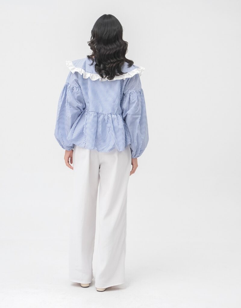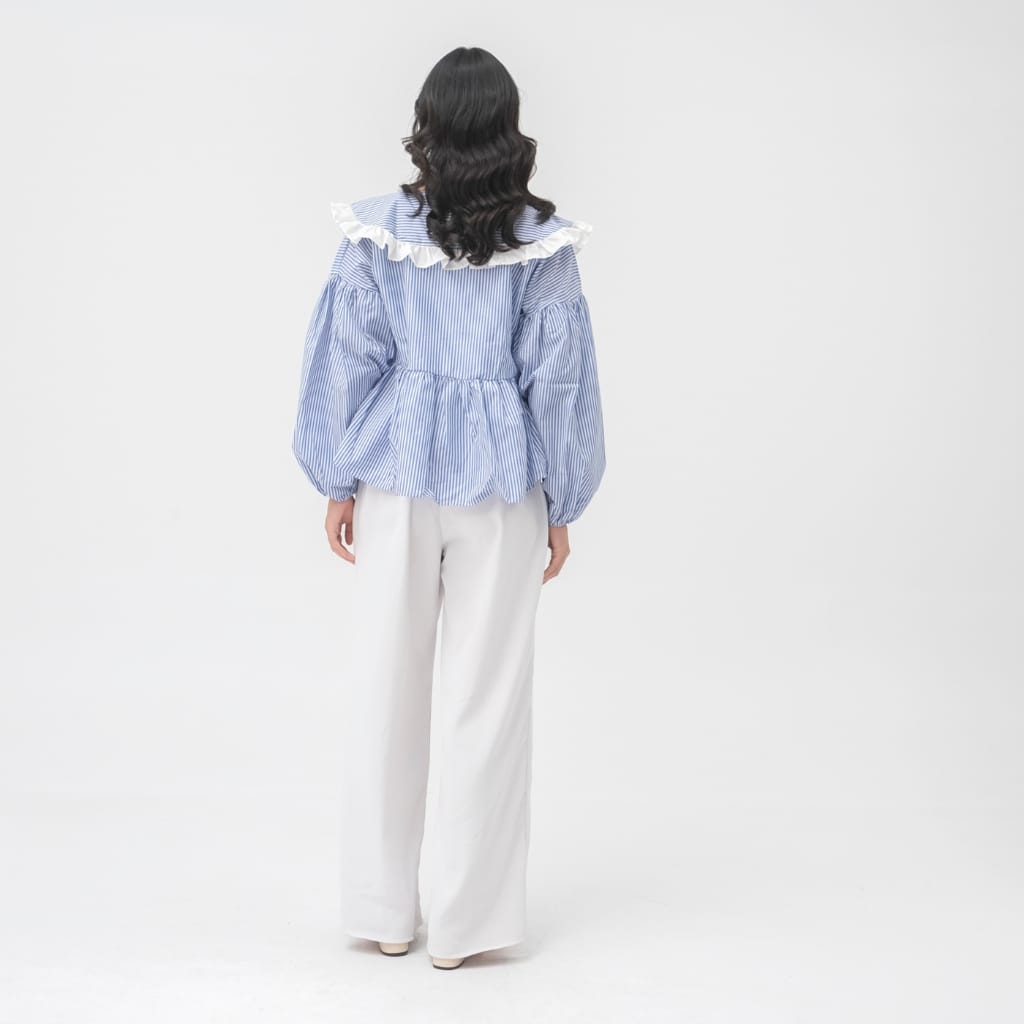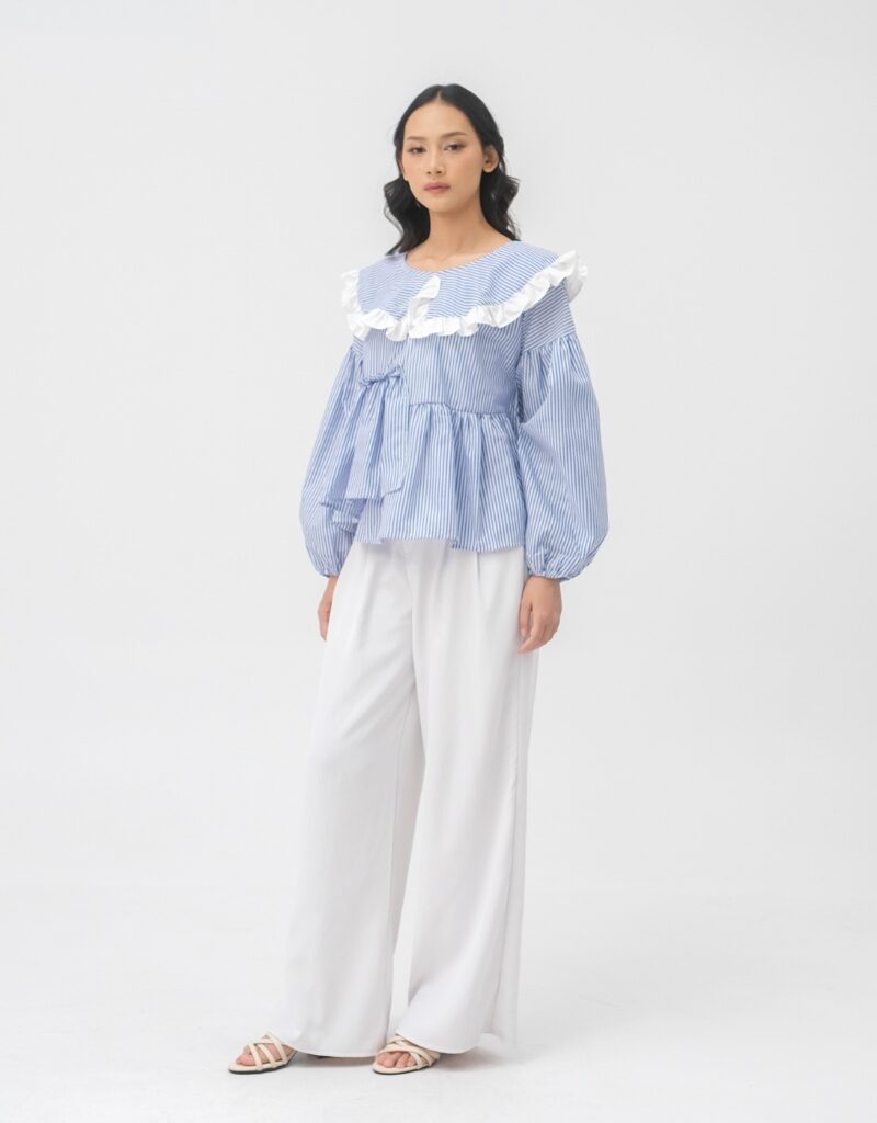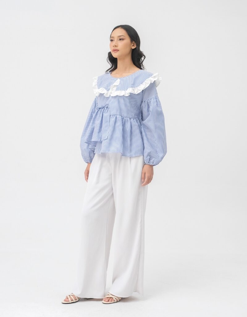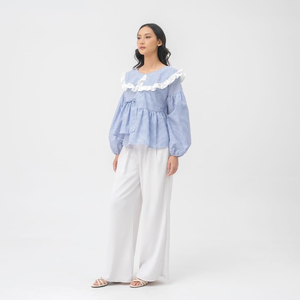 Medi Top adalah atasan wanita bermotif stripe biru-putih dengan sentuhan ruffle lembut di bagian kerah yang memberikan kesan feminin, fresh, dan effortless. Desainnya dibuat loose dengan detail gather di bagian dada, menciptakan siluet flowy yang nyaman dipakai sekaligus memberi efek lebih proporsional pada tubuh.