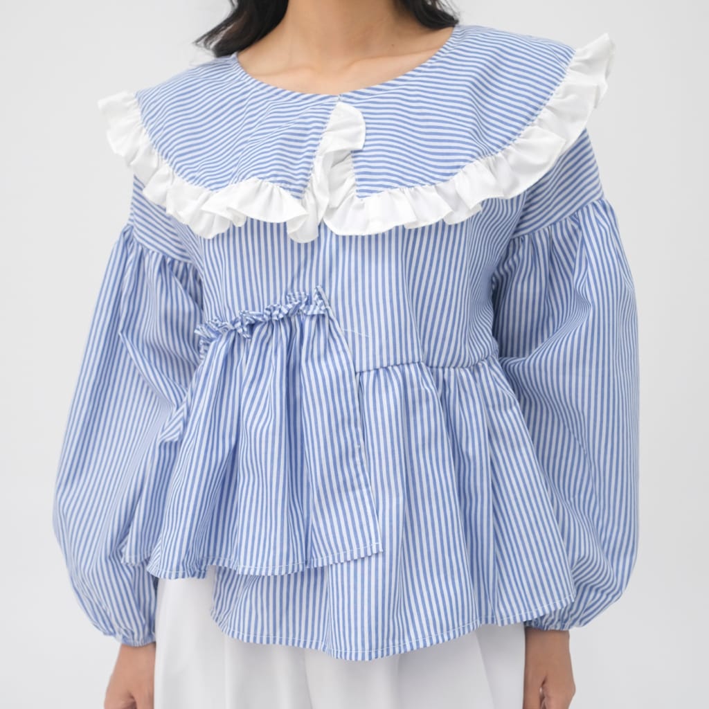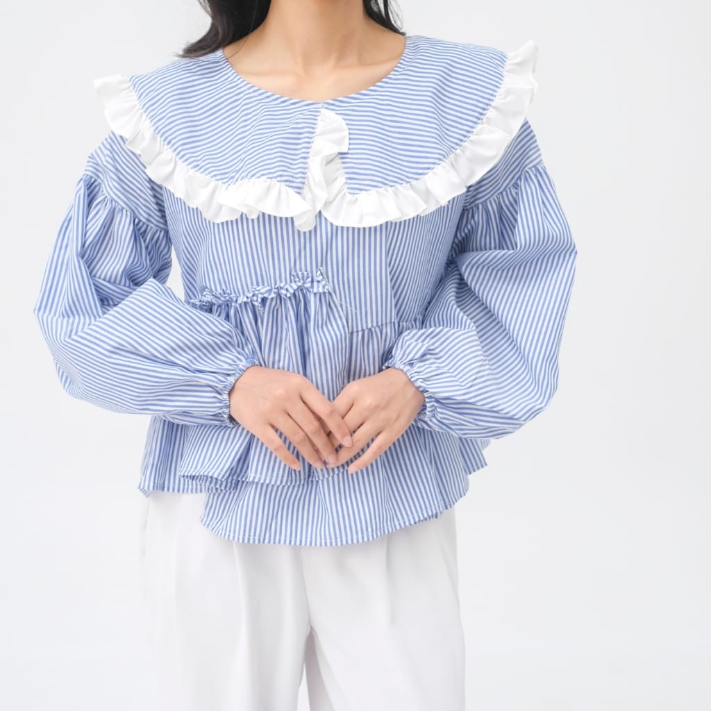 atasan wanita stripe, blouse wanita cotton, atasan ruffle wanita, baju wanita kekinian, blouse lengan panjang wanita, atasan wanita casual chic, blouse stripe biru