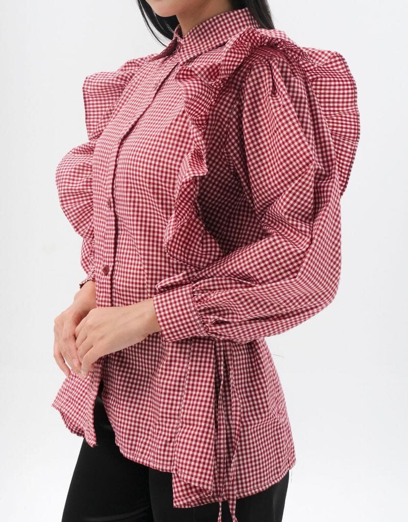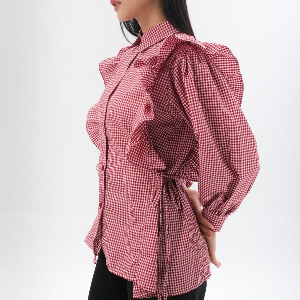 Vale Top hadir dengan detail ruffle yang mengalir dari bahu sampai bawah di bagian depan dan belakang, memberikan kesan dramatis dan feminin sekaligus edgy. Dilengkapi dengan tali detail di pinggang yang bisa diikat untuk mempertegas siluet, membuat penampilanmu makin stylish dan effortless.