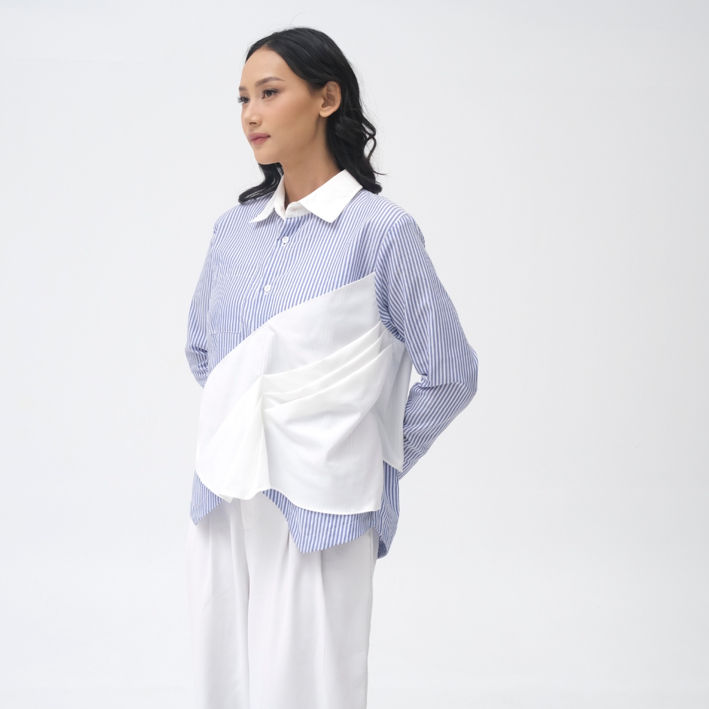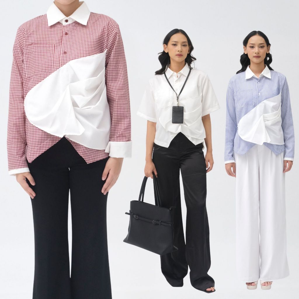 atasan wanita oversize, blouse wanita kekinian, kemeja wanita unik, baju kantor chic, blouse asimetris, atasan wanita casual
